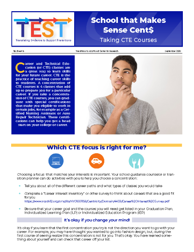 Research reveals that a concentration of career-specific CTE courses is correlated to finding full-time employment after high school. This practice guide readies special educators to complete career assessments and career exploration activities with students, work with students to create post-high school career goals, determine a progression of career-specific CTE courses to take in high school, and develop IEP supports to reinforce CTE learning.