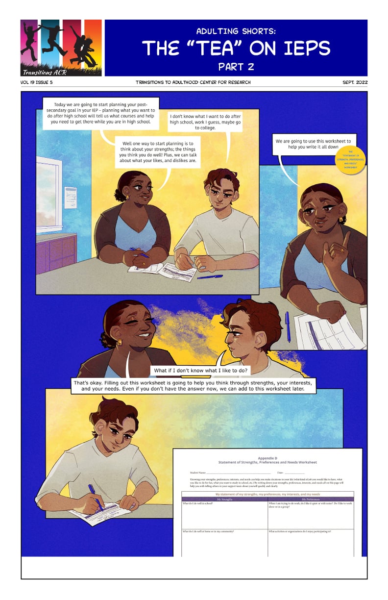 This info-comic is for high school students to help them understand what an Individualized Educational Plan or IEP is, what transition planning is, and the importance of the student being involved in them. Part 2 focuses on Mateo completing his IEP worksheet. Story by Emily Sudbrock. Artwork by Marina Gatesy-Davis.
