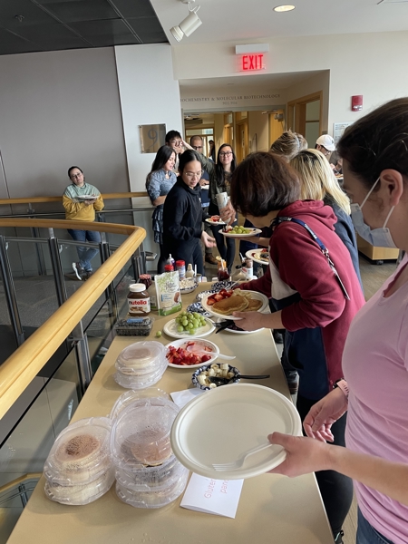 The Diversity Action Committee of the Biochemistry & Molecular Biotechnology Department at UMass Chan Medical School organized a celebration of round foods focused on pancakes. The committee provided pancakes (including gluten-free ones!) and lots of fixin's to create delicious a Build-Your-Own-Pancake Bar.