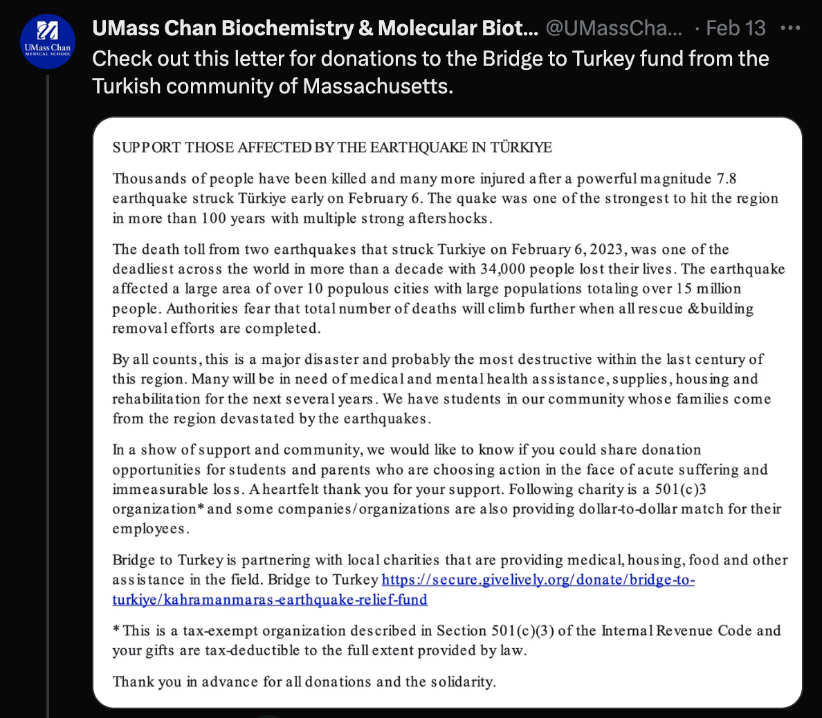 Bridge to Turkey is partnering with local charities that are providing medical, housing, food and other assistance in the field. Bridge to Turkey https://secure.givelively.org/donate/bridge-to-turkiye/kahramanmaras-earthquake-relief-fund