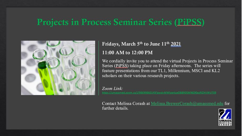 NEW Zoom Link: https://umassmed.zoom.us/j/93616067722?pwd=eHhKZ0h0djNWQlkwbnZSMmtUWEw5UT09 C Passcode: 003718 We cordially invite you to attend the virtual Projects in Process Seminar Series (PiPSS) taking place on Friday afternoons. The series will feature presentations from our TL1, Millennium, MSCI and KL2 scholars on their various research projects.Friday, April 30, 2021