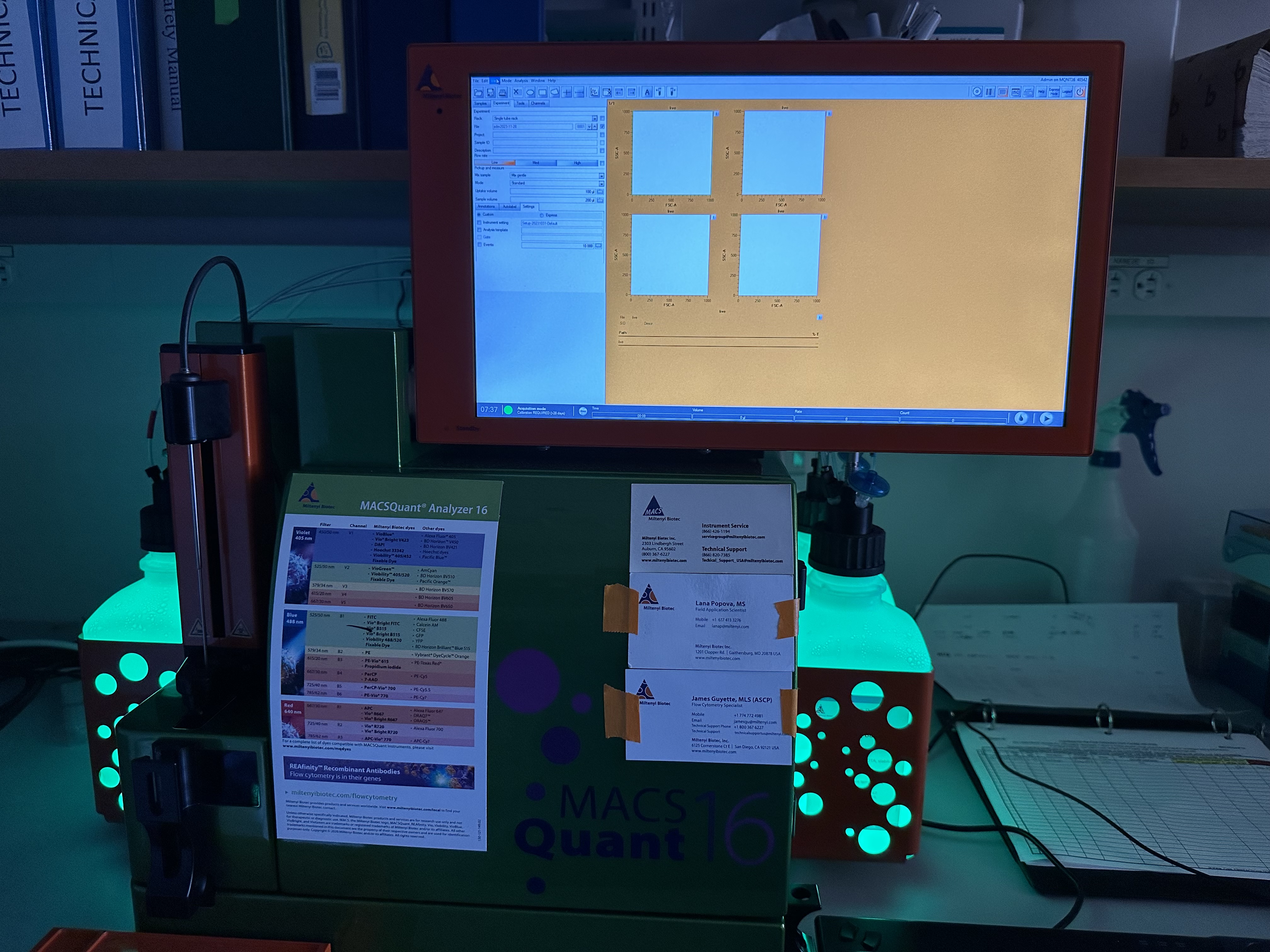 The Miltenyi MACSQuant 16 located in the Albert Sherman Center has a user-friendly interface and a plate sample loader. Equipped with three lasers (405, 488, 640 nm), two scatter (FSC, SSC) and 14 fluorescent channels. The MACS MiniSampler holds tube racks of numerous formats and microtiter plates. The MACSQuant 16 is dedicated to self-use after a brief training class. Contact the flow core for details at 6-3276.