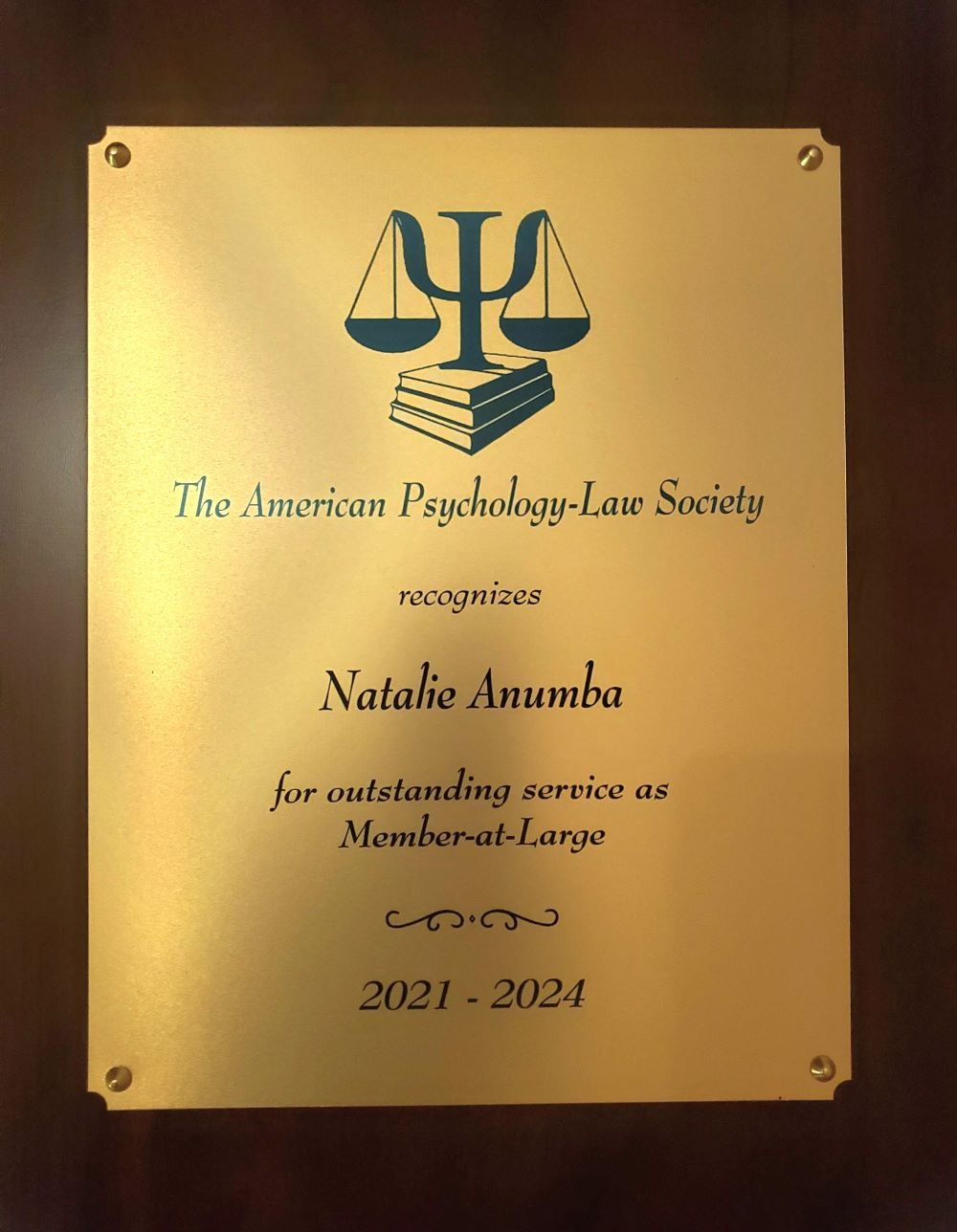 For the past three years, Dr. Anumba served as an elected Member-at-Large for the American Psychology-Law Society (Division 41 of the American Psychological Association). In recognition of her term overseeing and representing AP-LS special interest committees, participating in AP-LS governance and financial oversight, and functioning as a voting member of the AP-LS Executive Committee, she was given an award for “Outstanding Service as Member-at-Large.”