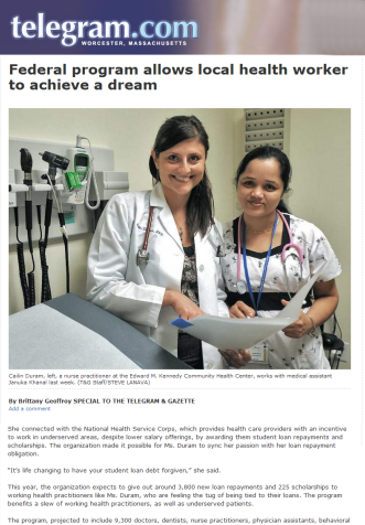 The Worcester Telegram & Gazette recently featured Cailin E. Duram, MSN, a 2009 Graduate School of Nursing alumna who dreamed of working in a community health center helping refugees. Her overwhelming debt from undergraduate and graduate student loans forced her to reconsider her career choice until she discovered National Health Service Corps, which offers incentives—such as student loan repayment—for health care providers who work in underserved areas. She is now a family nurse practitioner at the primary refugee health assessment site in Central Massachusetts, the Edward M. Kennedy Community Health Center in Great Brook Valley.