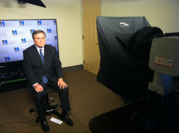 Michael L. Blute, MD, speaks about cancer research in the new TV studio on the B-level of the Medical School building.