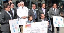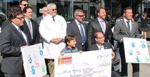 | Jack L. Leonard, PhD, (at center, in white coat), is presented with a $250,000 grant from the Hyundai Hope on Wheels program. |