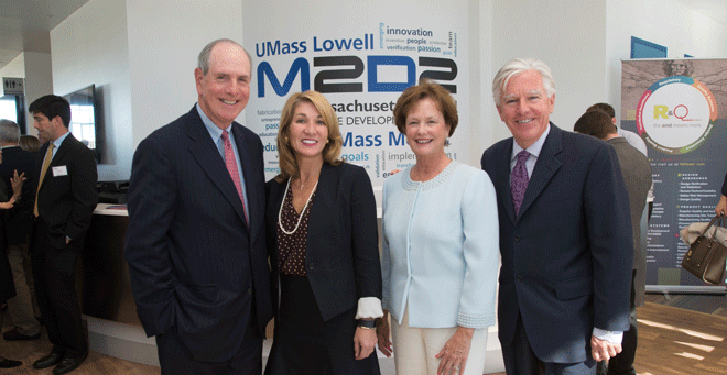 (from left) UMMS Chancellor Collins, Lt. Gov. Karyn Polito, UMass Lowell Chancellor Jacquie Moloney and UMass President Marty Meehan attended a ribbon cutting for the expanded M2D2 and new Innovation Hub incubators. |