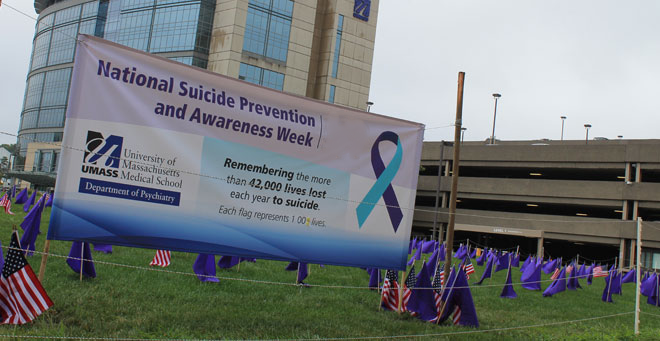 Flags representing the more than 42,000 deaths annually from suicide in the United States will be displayed at UMass Medical School for National Suicide Prevention Awareness Week. |