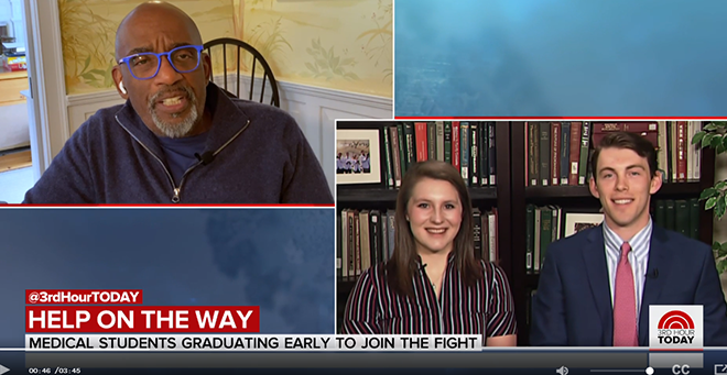 “We knew that having the option to graduate early and use our privilege to help take care of people during this pandemic is definitely something we were excited to help with,” said Kendra Lastowka, MD, SOM ’20, in a remote interview with the Today Show’s Al Roker.