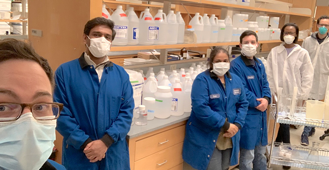 Six students, working with staff from the Environmental Health and Safety and Environmental Building Services departments, received temporary essential personnel status so they could work inside the Lazare Research building.