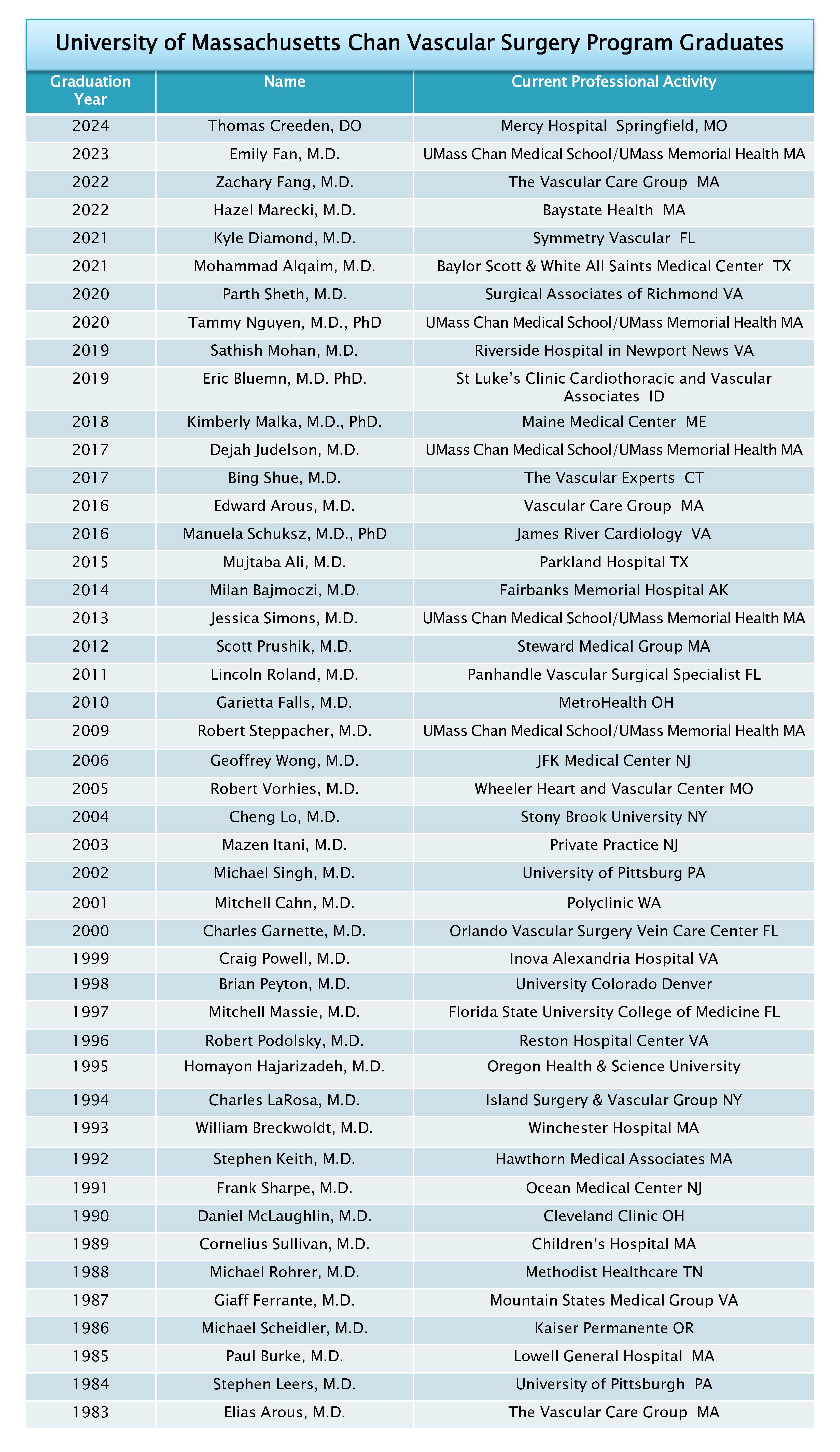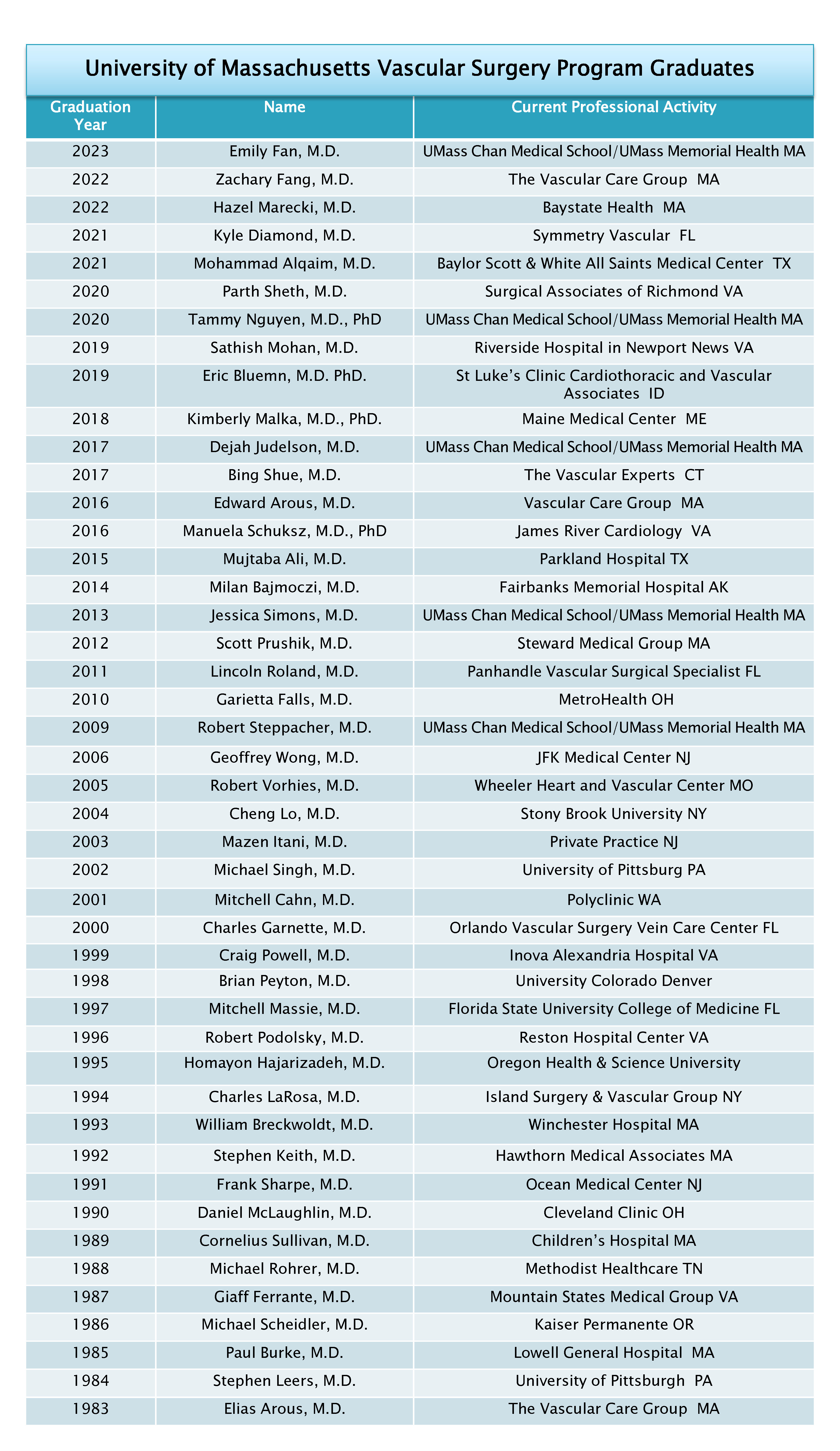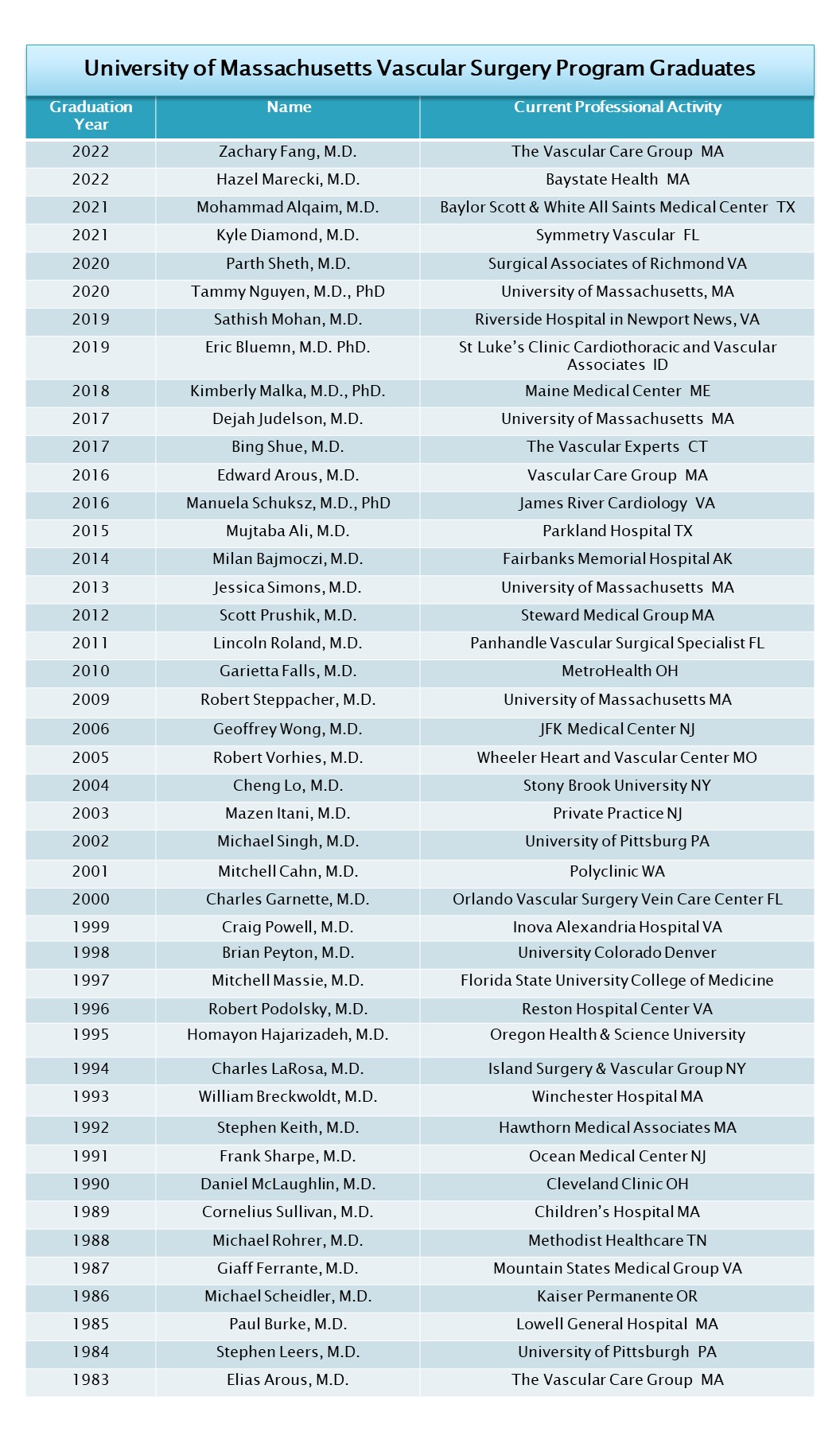 The Division of Vascular and Endovascular Surgery has demonstrated a longstanding commitment to educating future leaders in vascular surgery through our training programs in the UMass Chan Medical School. Our traditional fellowship was established in 1982. We are proud of our 36 graduates, all of whom are board-certified vascular surgeons, practicing in private, academic, and military practices. Our final fellowship graduate completed training in 2012.